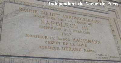 Cette mairie a été inaugurée en 1867, la même année que la mairie du 4e mais contrairement à celle-ci, elle a échappé à une destruction partielle lors de la Commune de Paris (le magnifique décor de la salle des fêtes de la mairie du 4e a été incendié en mai 1871 ce qui fait que les décors et les nefs de Paris que l'on peut y voir sont plus récents [voir article du 10 avril 2013]). A la mairie du 3e -et donc de Paris Centre-, toutes les nefs de Paris sont des exemples de nef du 2nd Empire que ce soit par exemple sur les grilles :ou sur les vitraux de l'escalier d'honneur :