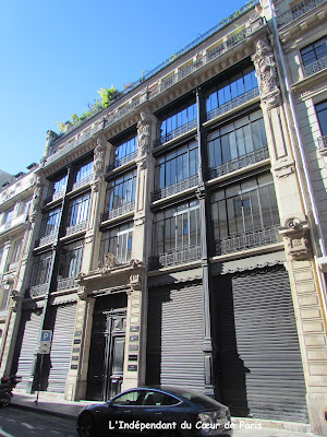 J'ai déjà consacré un article à la rue d'Uzès et au très bel hôtel particulier qui s'y trouvait jusqu'à la fin des années 1860 (voir article du 21 février 2022). On y trouve de nombreux immeubles construits dans les décennies qui ont suivi. Parmi ceux-ci, au n°13 on peut voir une très belle façade qui a attiré mon attention pour deux raisons.